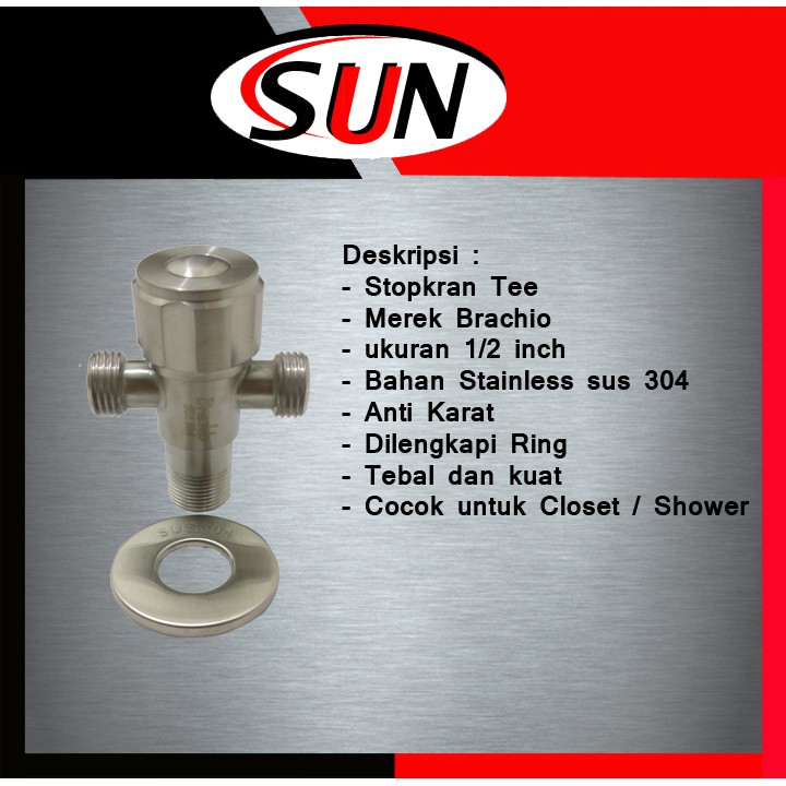 Deskripsi :- Keran Tee Closet- Merek Brachio- ukuran Drat 1/2 Inch- Bahan Stainless SUS 304- Anti karat- Cocok Untuk keran Jet Shower Closet / Shower-------------------------------------------------------------------------------------------------Keran Tee Brachio memilki Kualitas yang Baik dengan Pemilihan Bahan SUS 304 yang memberikan daya tahan terhadapa berbagai jenis air tanah / pam. tidak berkarat dan memilki finishing produk yang baik. cocok untuk Kamar mandi rumah AndaSalam,Sun Har