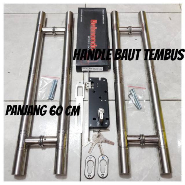 PAKET HANDLE PINTU STAINLESS BAUT TEMBUS PANJANG 60CM. DIAMETER PEGANGAN 3,5CM PERLENGKAPAN NYA SEPERTI DI FOTO PERTAMA2 SET= 4 GAGANG ( LUAR DAN DALAM )1 SET BODY PELOR COMP KEY ISI 4 ANAK KUNCI.SUDAH DILENGKAPI BAUT/SEKRUP PEMASA