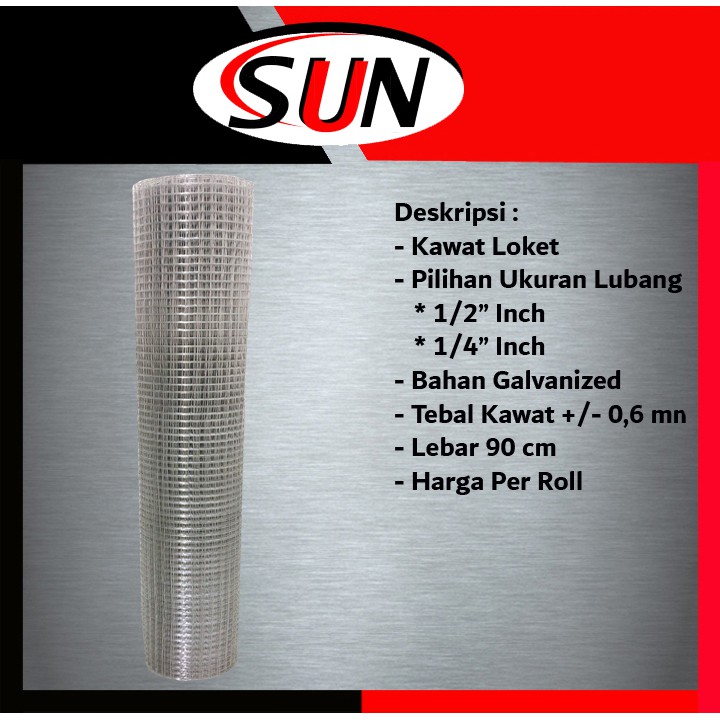 Perhatian :- Pembelian Kawat Loket 1 Roll disediakan Fitur FREE RETURNS Untuk Dikembalikan. Dikarenakan Mungkin Terjadi Cacat dalam Kawat loket yang tidak bisa kami cek karena Masih dalam segel Pabrik.Deskripsi :- Kawat Loket / Kawat Ram- Pilihan Ukuran Lubang * 1/2" Inch * 1/4" Inch- Lebar 90 cm- Bahan Galvanized- Per Roll 10 Meter- Harga Per Roll- Cocok untuk kandangKawat Loket banyak digunakan baik dalam proses pembangunan maupun pembuatan kandang / ayakan pasir. Salam,Sun Har