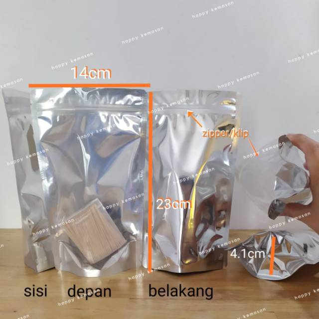 Standing Pouch Transmetz Silver 500gr dilengkapi zipper. Ukuran : 14 x 23 x 4,1cmMaterial Depan : Transparan, VMPET/ SPE Belakang : PET/ SPEKelengkapan : Zipper, tear notch (v-cut) Kapasitas : 500gr gula pasir 250gr kopiPemesanan min. 100 pcs (1 pack) berlaku kelipat