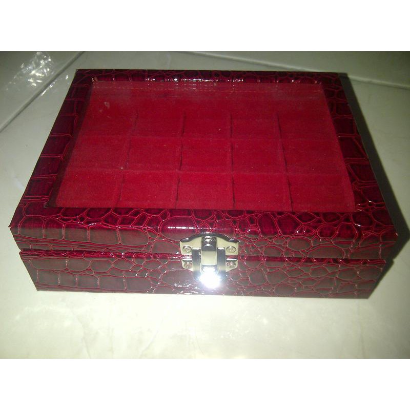 Deskripsi ProdukKOTAK TEMPAT PERHIASAN DAN CINCIN AKIK yang tampilannya sangat modis, elegan dan ekslusif dengan kaca pada bagian atasnya. Berfungsi untuk melindungi PERHIASAN DAN CINCIN AKIK anda dari debu atau kotoran lainnya.Kotak ini muat untuk 20 buah cincin, jadi sangat berguna jika cincin atau perhiasan disimpan dalam waktu yang lama, atau bisa juga untuk dipajang karna walaupun dalam kotak tapi cincin tetap terlihat dari atas.Ukurannya sedang: panjang: 17cm, lebar: 13, dan tinggi 5.5cm.Bahan terbuat dari triplek berlapis kulit sintetis, dan bagian dalamnya dilapisi beludru merah yang empuk.Warna : Merah, Hitam, Cokla