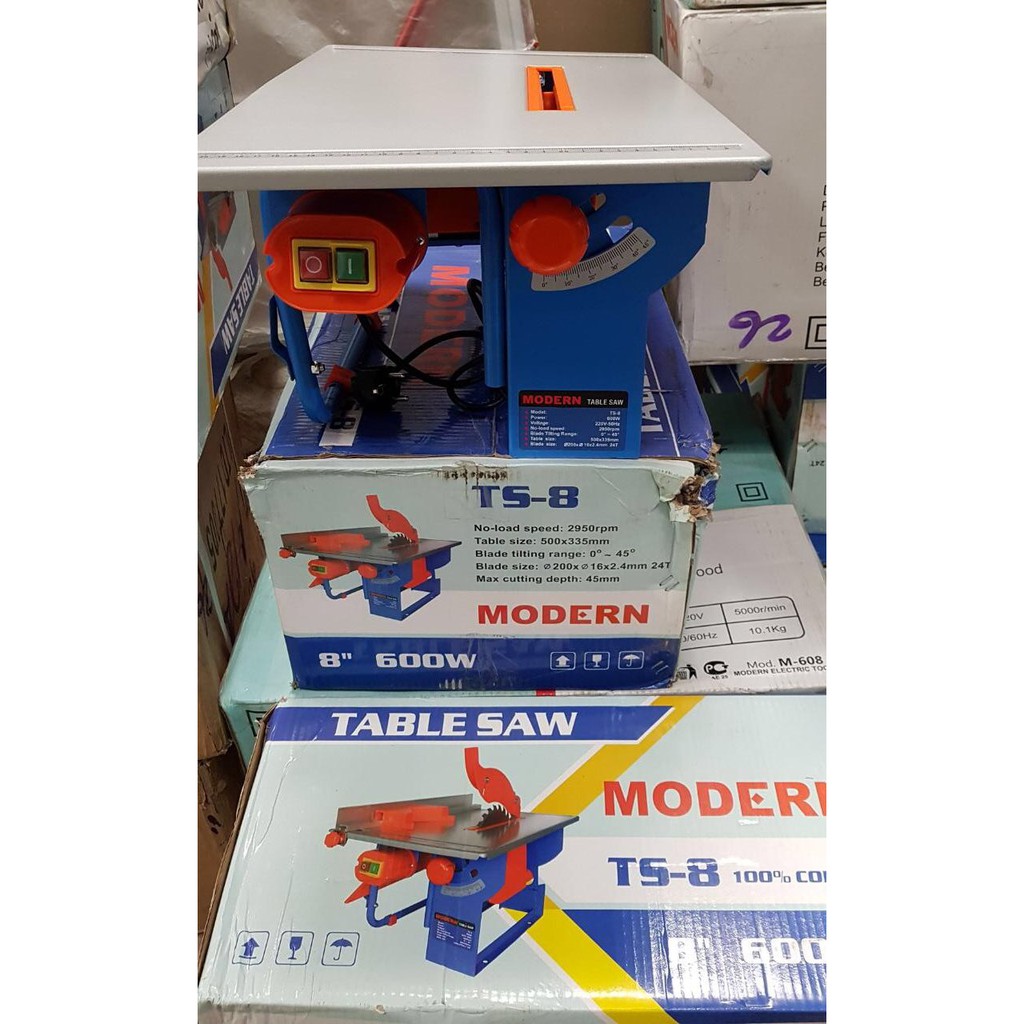 MODERN Mesin Gergaji Meja / Table Circular Saw 8" (200 mm) TS-8Merk : MODERNModel : TS-8Daya : 600 WattVoltage : 220 V / 50 HzUkuran mata pisau : 8" (200 mm)Ukuran meja : 500 x 335 mmKemiringan Meja : 0 - 45 DerajatKedalaman potong : 45 mm (Maksimal)Rpm : 2950 r/min (tanpa b