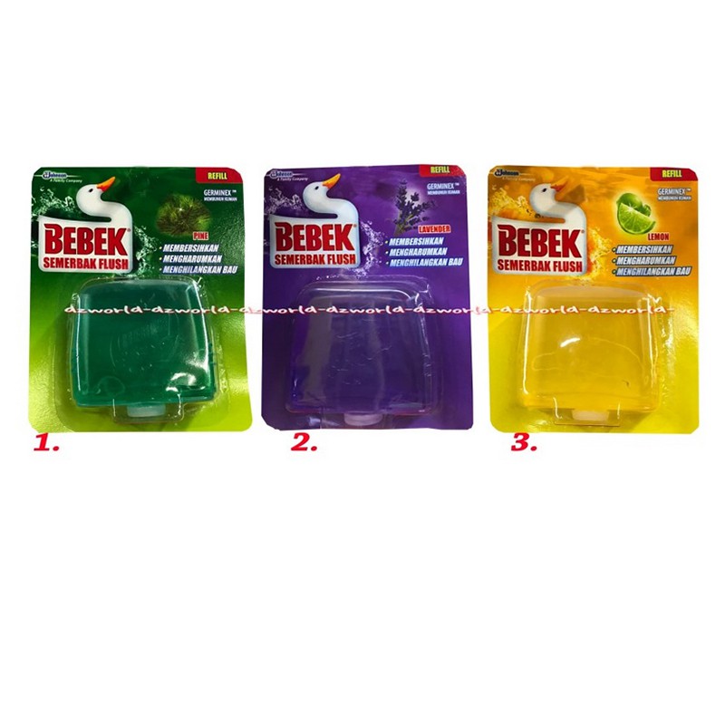 Merek : BebekJenis : Pengharum ToiletDengan 3 Pilihan Wangi :1. Hijau - Pine2. Ungu - Lavender3. Kuning - Lemon* Harga untuk Satu Bebek Semerbak Flush Refill 50ml * Berat menggunakan volume* Silahkan tambahkan bubble wrap untuk keamanan paket hanya + Rp 1500> Bebek Semerbak Flush dengan formula berbusa> Membersihkan, mencegah pembentukan kerak di permukaan kloset sekaligus mengharumkan udara di toilet> Mengandung germinex yang efektif membunuh kuman penyebab bau tidak sedap> Tidak berbahaya untuk septic tank> Bebek Semerbak Flush tahan sampai 300x flush- Mohon Berikan keterangan pilihan warna / nomer / Wangi yang anda inginkan jika tidak memberikan keterangan kami akan mengirimkannya secara random -^ Dapatkan dan Percayakan semua kebutuhan Anda lainnya hanya di Toko DZWorld, Grab it F