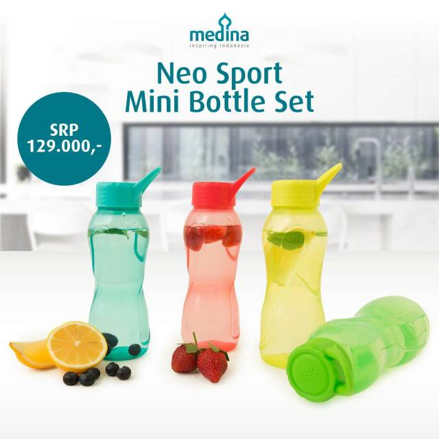 Hidupkan harimu dengan warna - warni cerahnya Neo Sports Mini Bottle Set.Jaga kesehatan dengan rutin minum air putih. Selalu penuhi asupan harian air putih Anda, bahkan saat berpergian sekalipun!.Neo Sports Mini Bottle Set, hadir dalam 4 warna cerah , ukurannya yang mini membuatnya praktis untuk dibawa.Siap untuk menemani berbagai aktifitas Anda dimanapun berada.1 set Neo Sports Mini Bottle Set, terdiri dari:- 4 botol minum ukuran 350 ml, dengan warna yang berbeda: Tosca, Hijau, Merah, dan Kuning.Material Plastik PP5Berat Produk:- Volume : 0.6 kg- Real : 0.2 kgDapatkan koleksi Neo Sports lainnya:- Neo Sports Maxi Bottle set- Neo Sports Bottle (Set of 3)#medina #ddc #dusdusan #botol #m
