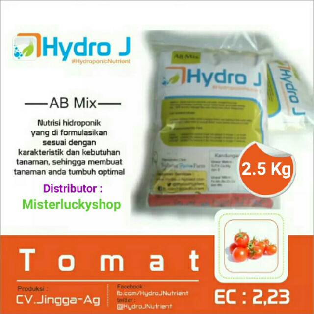 Apa itu Hydro J :Nutrisi Hydroponik siap pakai, mengandung unsur hara yang dibutuhkan tanaman, dengan bahan - bahan yang mudah diserap dan 100% larut Air, sehingga tidak akan menyumbat sistem fertigasi tetesCara Membuat Pekatan :Larutkan Kantong A dalam wadah A menjadi 5L kantong B plus unsur micro (warna hijau) dalam wadah B menjadi 5L, Kocok sampai benar - benar larutPembuatan Larutan Siap Pakai :Semai : Larutkan 3ml pekatan A dan 3ml pekatan B dengan 1L air bersihVegetatif : Larutkan 5ml pekatan A dan 5ml pekatan B dengan 1L air bersihGenetatif : Larutkan 7ml pekatan A dan 7ml pekatan B dengan 1L air bersihKandungan dan Jenis :Unsur Makro : N,P,K,Ca,Mg dan SUnsur Mikro :Fe,Mn,Bo,Zn,Cu,dan MoEC : 2,23#HydroponicNutrient#Nutrisitomat#Misterluck